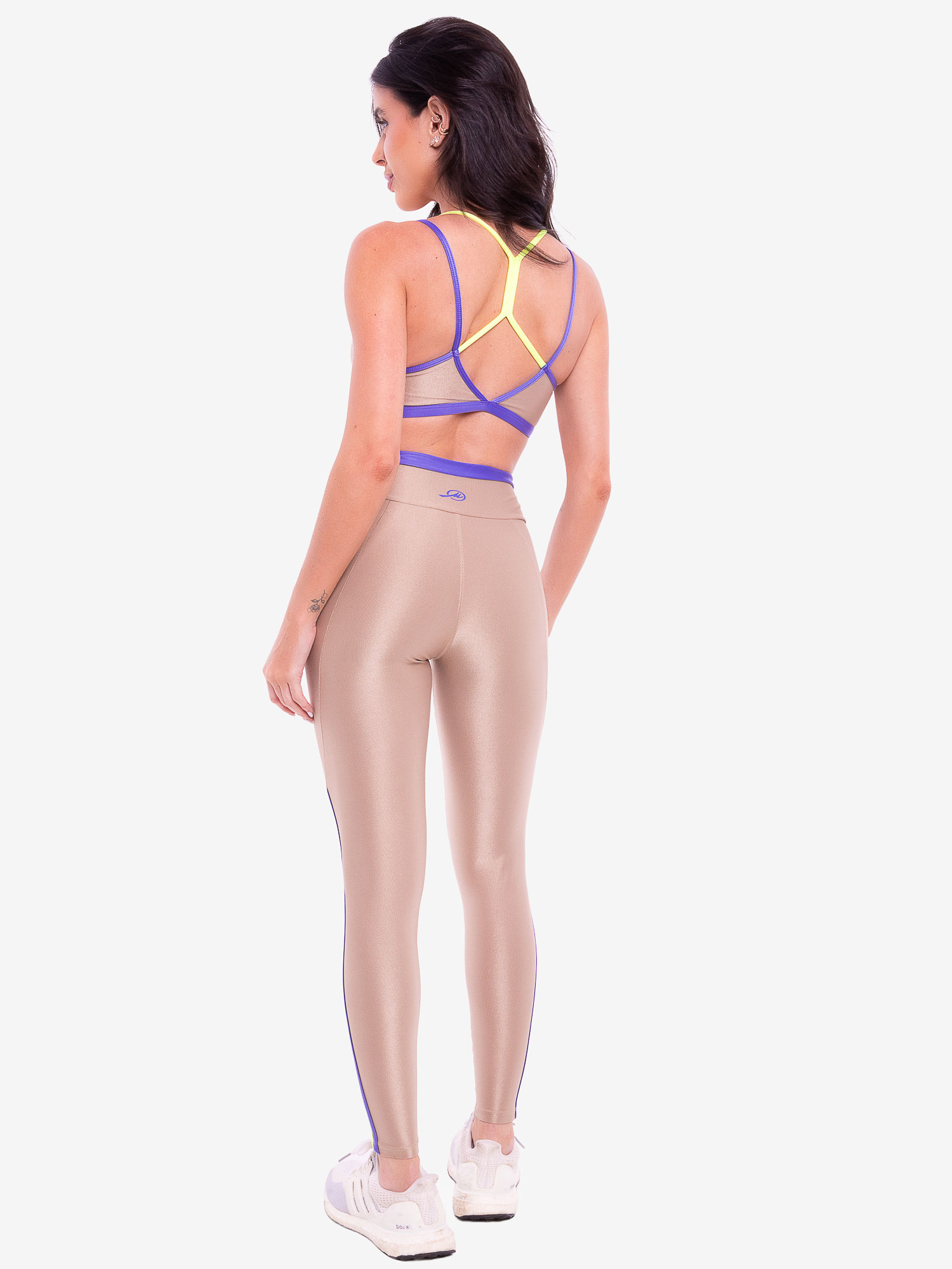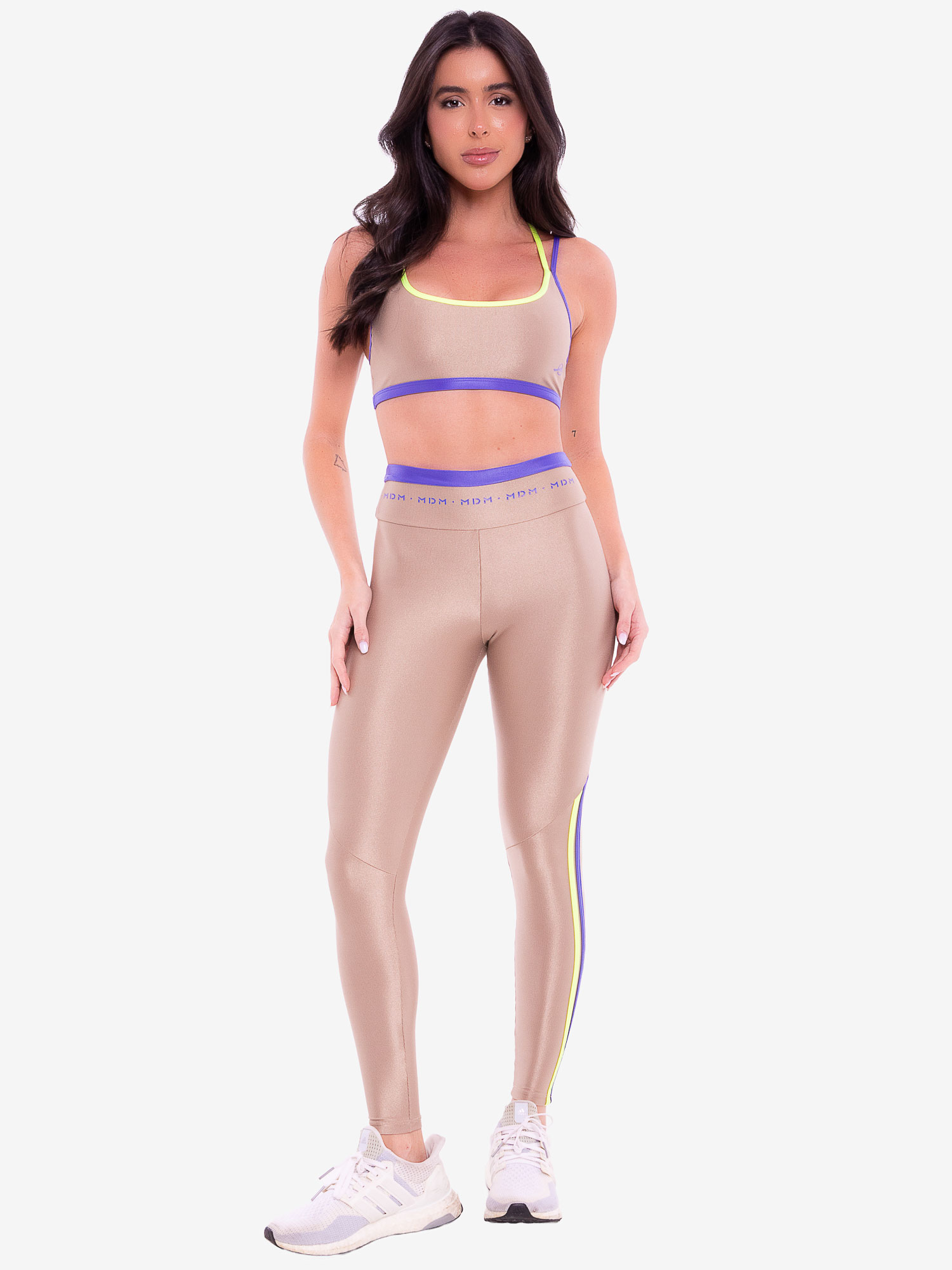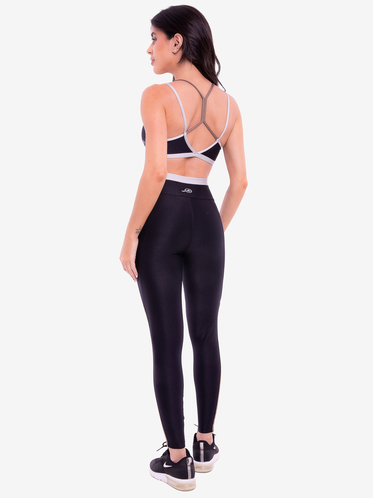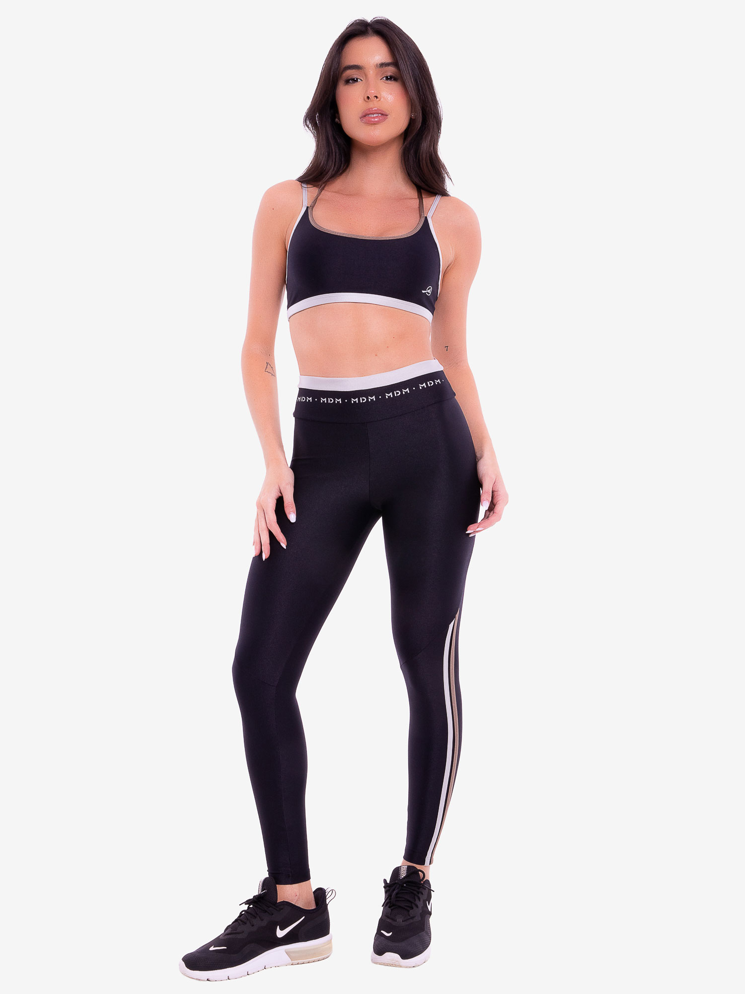 Legging cintura alta. Cós duplo largo. Recorte anatômico nas laterais. Detalhe de listras em 2 tons no recorte. Feito em malha fit power. Possui proteção UV+50. Acabamento com silk personalizado no cós.