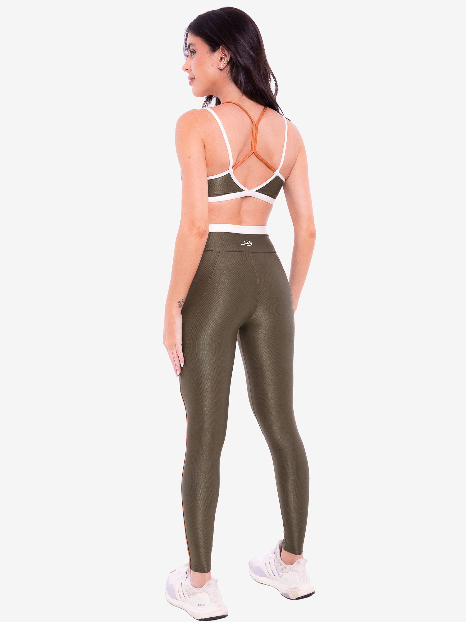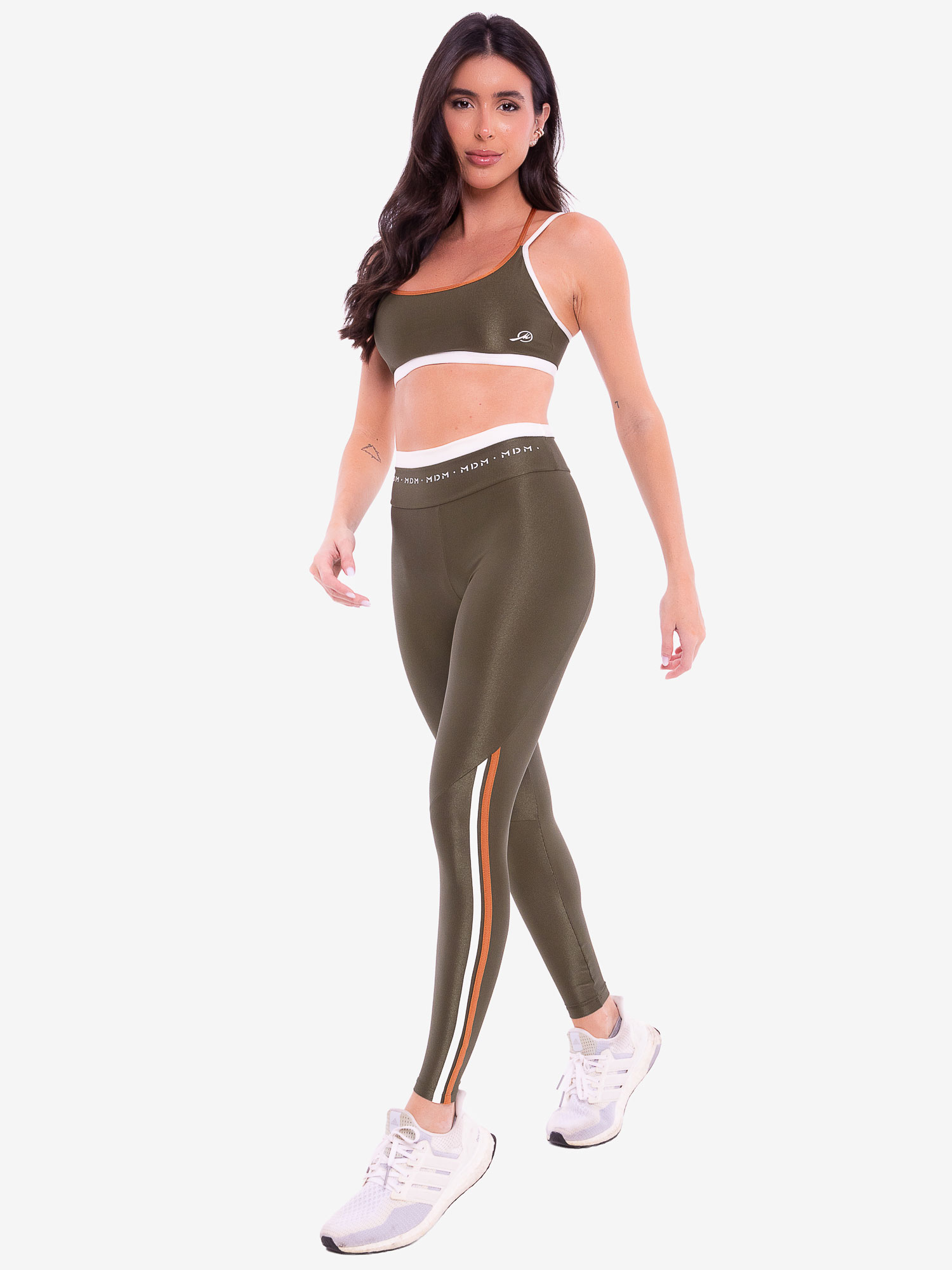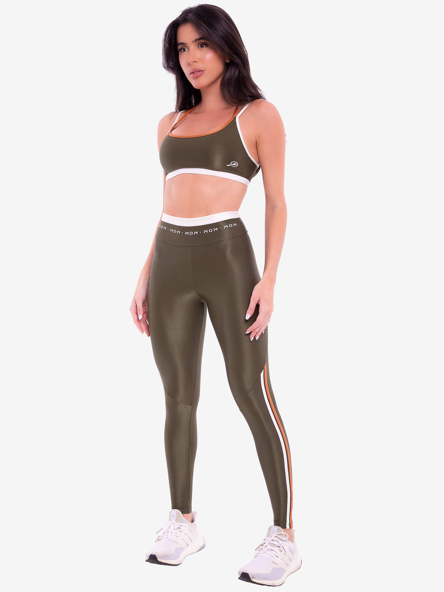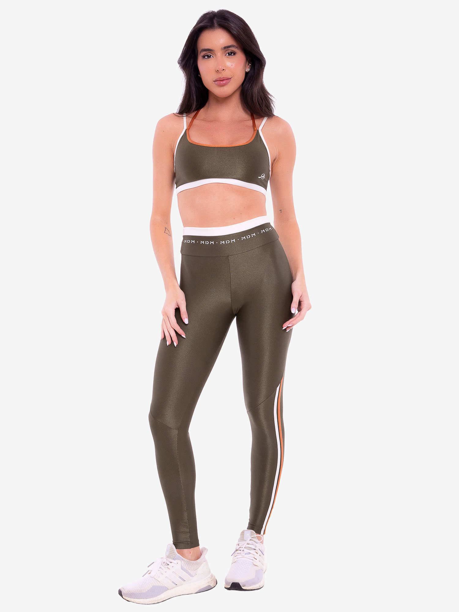 Legging cintura alta. Cós duplo largo. Recorte anatômico nas laterais. Detalhe de listras em 2 tons no recorte. Feito em malha fit power. Possui proteção UV+50. Acabamento com silk personalizado no cós.