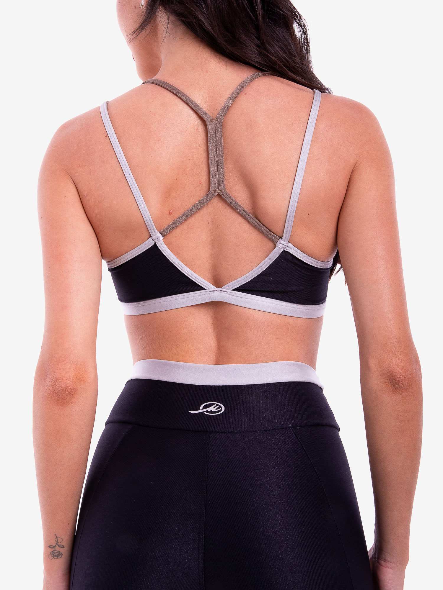Top tipo camiseta. Alças duplas reforçadas com elástico com efeito cruzado e vazado nas costas. Mistura de cores nos detalhes. Feito em malha fit power possui proteção UV+50. Acabamento com silk personalizado.